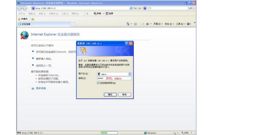 ②在IE浏览器输入“192.168.0.1”,进入后输入用户名“admin”用户名密码“admin”登录到设置页面;