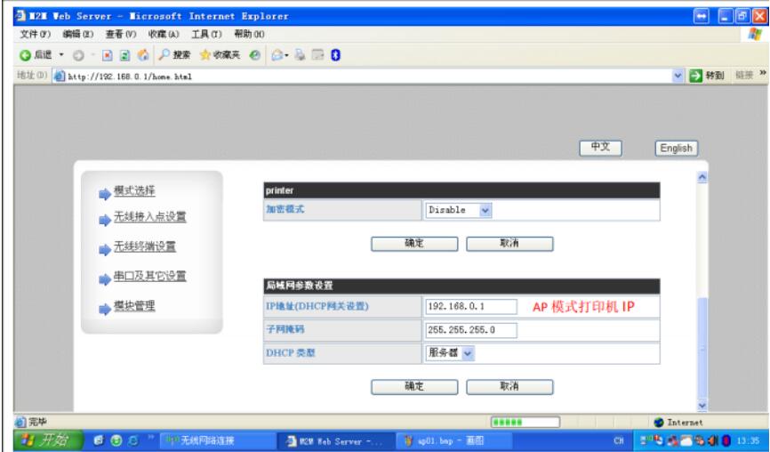 Wifi AP IP:192.168.0.1,255.255.255.0【AP模式打印机IP地址】