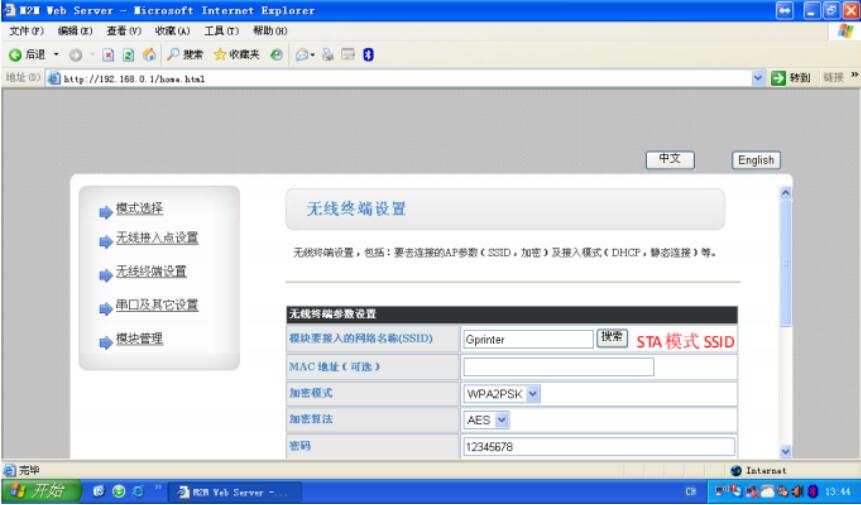 ⑤点击“无线终端设置(STA)”,设置STA模式下打印机参数:
