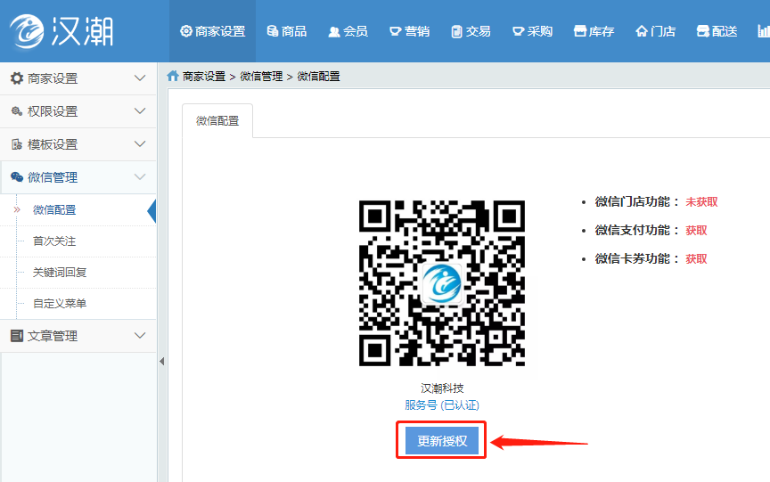 路径:电脑端后台-商家设置-微信管理-微信配置-更新绑定。
