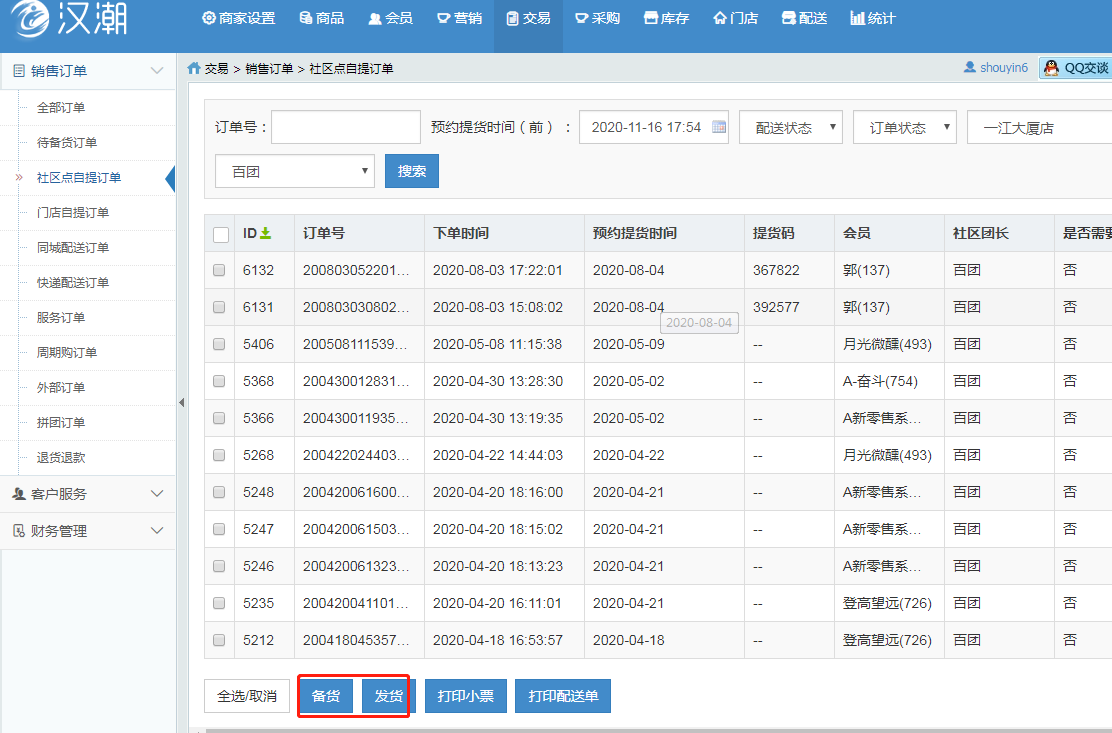路径: 店铺后台-交易-销售订单-社区点自提订单,选择预约提货时间搜索订单备货、发货、打印小票