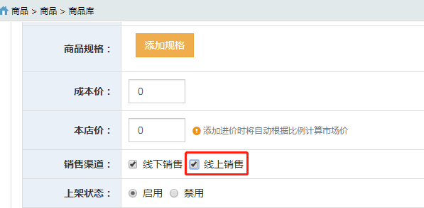 路径: “后台”-“商品”-“商品库”;添加/编辑商品,销售渠道开启线上销售