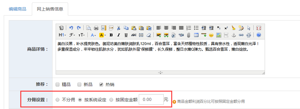 如图,商品的分佣设置可分为“不分佣、按系统设定、按固定金额”三种;(具体的分销设置请到后台-营销-全民拓客-拓客奖励中设置)