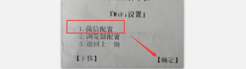 ③小票纸自动打印出来设置向导,显示“WIFI设置”,微信配置前有对勾,点击右侧建确定,进入微信配置(按照设置向导操作即可);