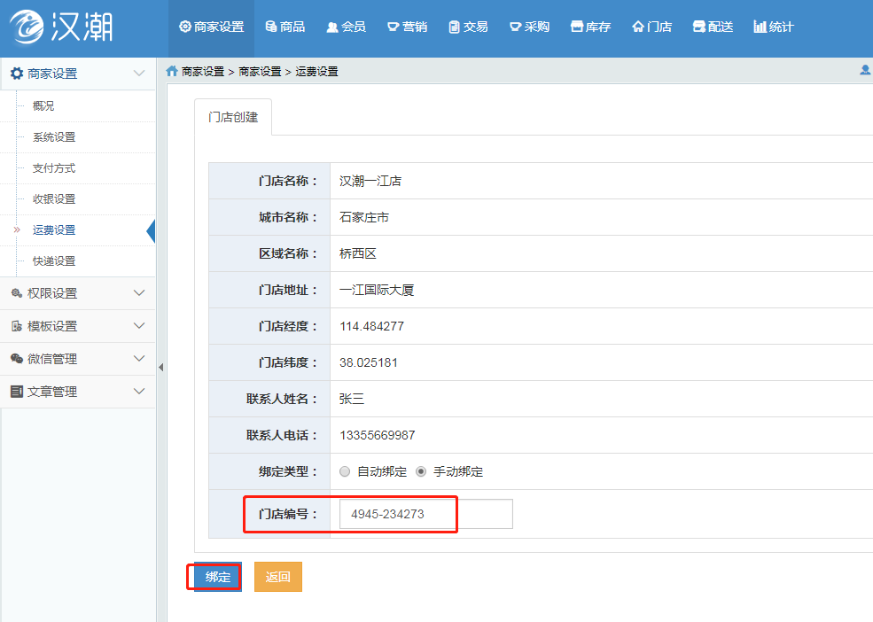 绑定类型选择“手动绑定”,把之前复制的“编号”填写到“门店编号”框中,点击绑定