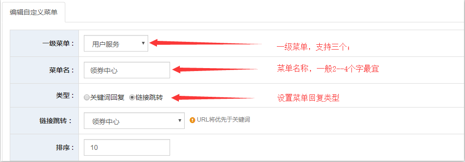 ②设置菜单名称,回复类型;