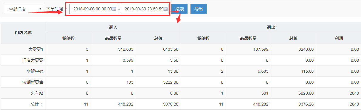 2、查询关于某个门店在一段时间内的调入调出情况;